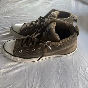 Classic Converse high-tops. Brown canvas with white accents. Comfortable and stylish.