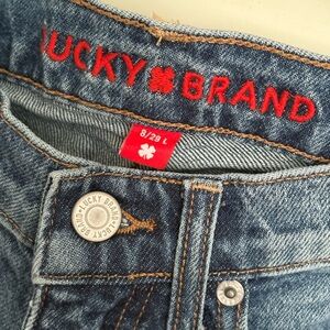Authentic Lucky Brand straight leg jeans in a classic medium wash with subtle stud detailing along the outer leg seams.