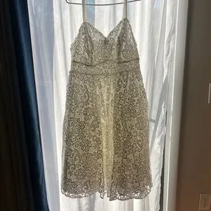 Chic white lace midi dress. Features delicate lace overlay. Ideal for elegant occasions. Features white lining and tulle layers underneath to create flare.