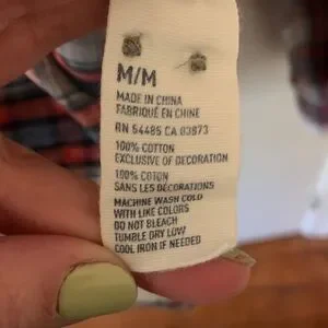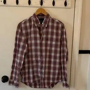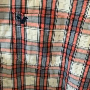 American Eagle men's plaid shirt featuring a classic red and blue design. Button front, one chest pocket. 100 % cotton; Size M, excellent condition.