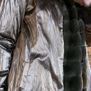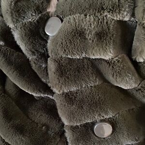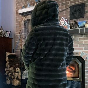 Stay warm and stylish with this luxurious faux fur hooded coat. Perfect for any occasion, this coat features a plush design in a rich dark green color. Ideal for adding a touch of elegance to your winter wardrobe. Stunning coat that is reversible. Button closure. PTP Approx. 22” Length 35” approx.