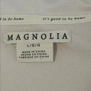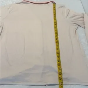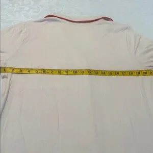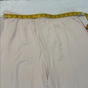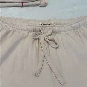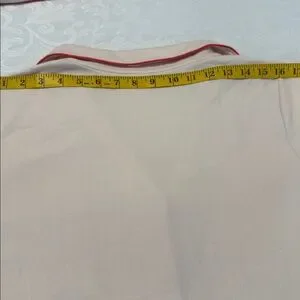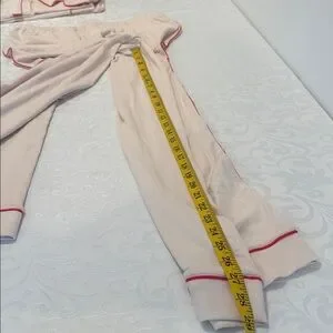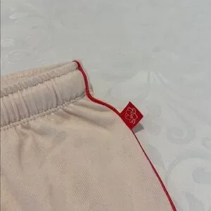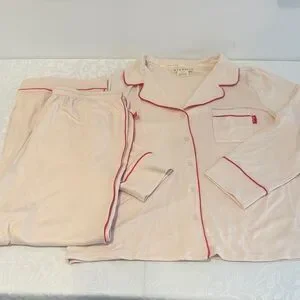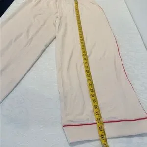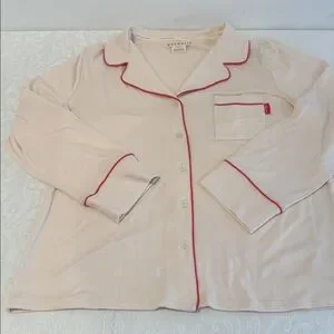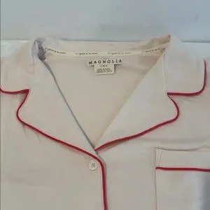 Elegant cream pajama set with striking red trim. Soft fabric. Button-up top with pocket. Comfortable pants.