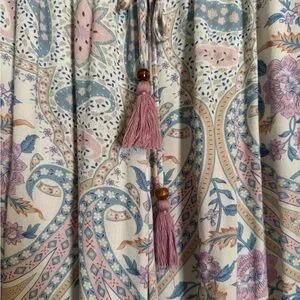 Vibrant bohemian skirt with intricate patterns. Features a mix of orange, blue, and cream hues.