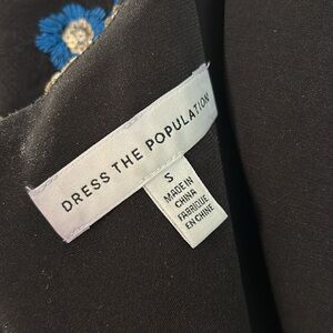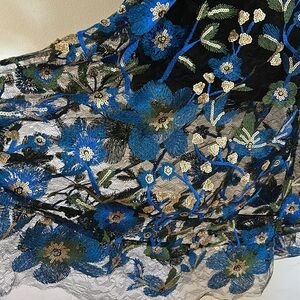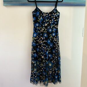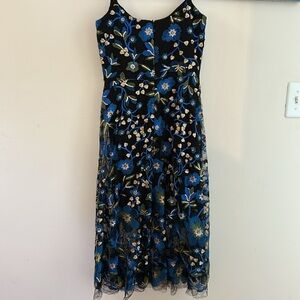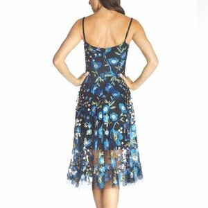 Elegant midi dress with vibrant blue floral design. Features a fitted bodice and flared skirt. Perfect for special occasions.