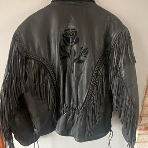 Unik Black Leather Jacket with Fringe and rose Design women’s size XXL
