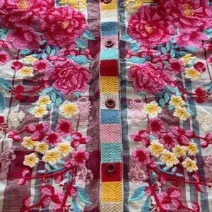 NWT Savanna Jane long-sleeve button-up is a vibrant red & blue plaid shirt heavily embroidered with colorful floral designs (pinks, yellows, and turquoise). It's 100% cotton, giving it a comfortable, breathable feel. Charming details include a blue-and-white striped contrast collar and multi-color stitched button placket, adding extra character.