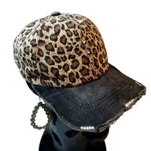 Leopard Distressed Baseball Cap with Adj. Strap & Swarovski Crystals