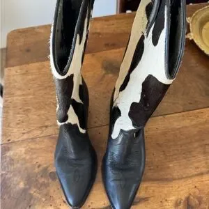 Step out in style with these unique cowhide Western boots. Featuring a striking black and white design, these boots are perfect for making a statement. Leather is in good condition, the hide has some wear as seen in the photos. Inside of the boot lining is worn as well. 6.5, fits more like a 6. Super fun boot!