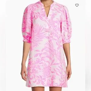 Crafted of lightweight lagoon linen, Lilly Pulitzer's Mialeigh shift dress features a palm print, elbow-length puff sleeves, and a V-neck.
