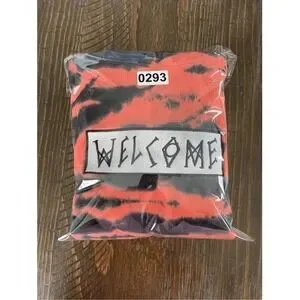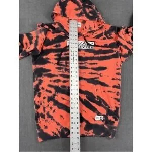 Welcome Skateboards tie dye hoodie in mens size S with bold orange and black patterning and stitched Welcome patch at the chest. Features a pullover fit with drawstring hood, kangaroo pocket, and fleece interior. True skater style with a lived-in look. Please note visible bleach spots on the back as shown. Please see photos for measurements.