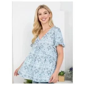 Super cute light blue printed drop-top with short sleeves and a v-neckline. 96% rayon & 4% spandex.