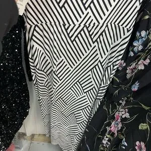 Elegant strapless dress with striking black and white pattern. Perfect for any occasion.