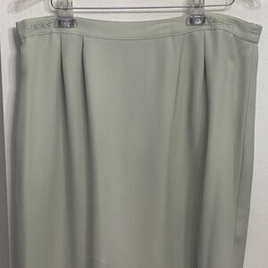 Dressy mint green pastel jacket and skirt suit. The size is 16W and both the skirt and the jacket are fully lined. The blazer is 27 inches long and the sleeves are 24 inches long. The skirt features beaded details on the waist line. It is 23 inches long and 37 1/2 inches around the waist. The color is pale green perfect for Spring and Summer occasions. Its classic design offers a timeless look. Pre-owned in good condition.