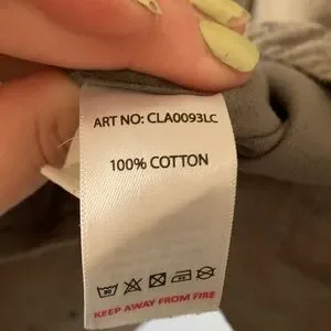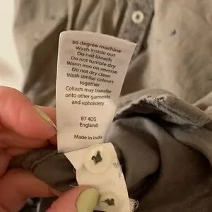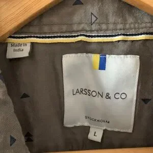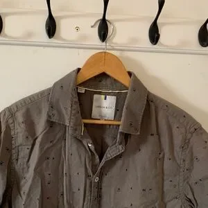 Olivey green/gray short sleeve shirt. 100% cotton, button down, size L. Blue triangle pattern all over. Excellent condition.