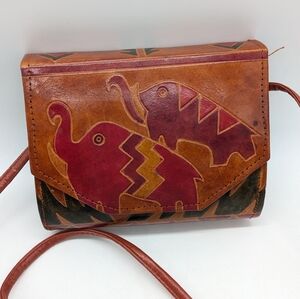 Vintage Orange Red Safari Elephant Leather Crossbody Bag Purse
