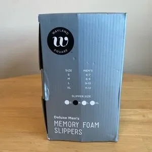 These are Wayland Square Deluxe Men's Memory Foam Slippers in brown. The slippers feature a soft microsuede upper, a cozy lining (often faux fur), and high-density memory foam insoles for comfort.