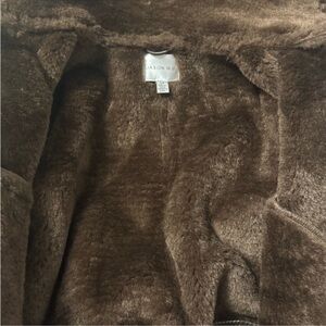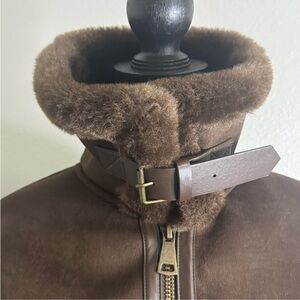 Luxurious chocolate shearling jacket. Soft and warm texture. Ideal for elegant style.