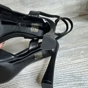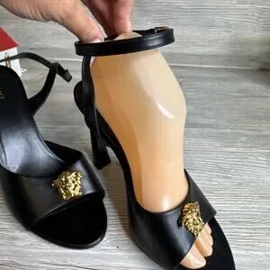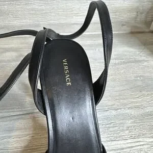 The product is a pair of Versace black leather high heel sandals with the iconic Medusa design, featuring a strappy style and buckle closure. Made in Italy, these size IT 39 sandals in US size 8 are designed for women looking to make a statement with their footwear. The leather upper and outsole provide both durability and a luxurious feel, making them a stylish and versatile option for any outfit or occasion.