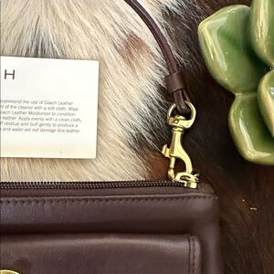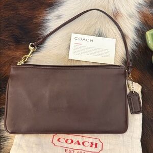 Y2K coach dark brown wristlet by Coach. Features a front flap pocket and elegant gold-tone clasp.