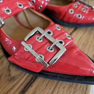 $395 Ganni wide welt buckle ballerina flats in racing red patent crinkled leather.