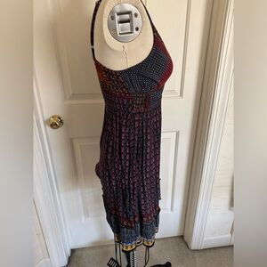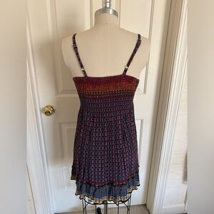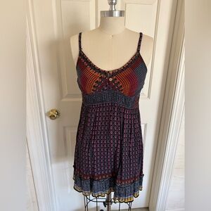 Vibrant dress with spaghetti straps and a colorful pattern. Features a mix of red, orange, yellow, and blue hues.