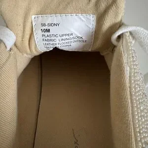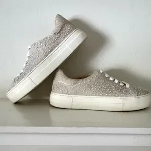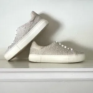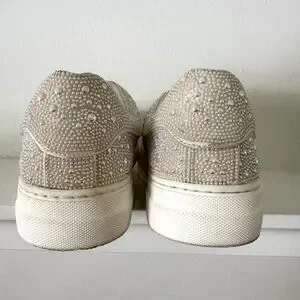 Step out in style with these elegant pearl-embellished women's sneakers. Perfect for adding a touch of glamour to any outfit from bridal to a fun pop of whimsy with jeans. Preloved. Condition very good.