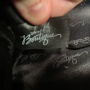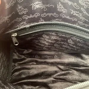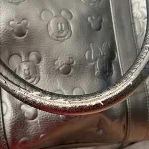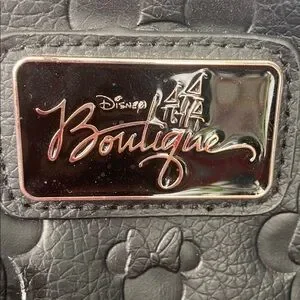 Inside includes a zipper side pocket and open side pocket with the text “Disney Boutique” all over, some wear on the handles