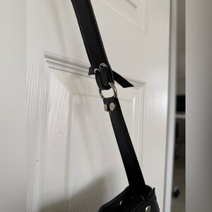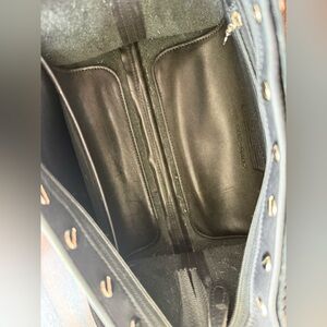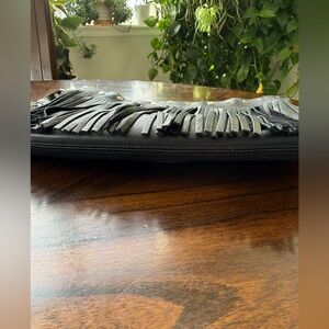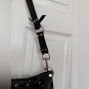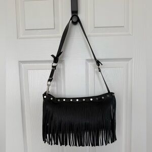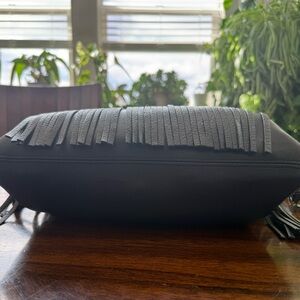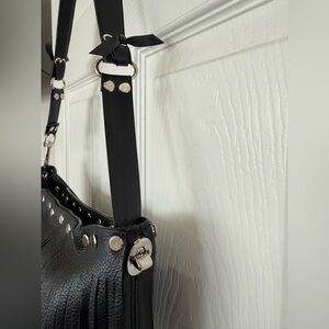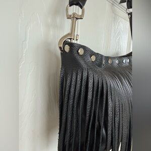 Leather Fringe was added to the front of the bag using screw back rivets. The leather was very soft at the strap. The bag had been modified previously. I added length to the strap with unbranded leather strips and silver-tone hardware. The strap has one side with the Dog leash clip and the other side with a Turnlock. Just a fun, upcycled not-perfect bag!