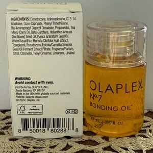 OLAPLEX No.7 Bonding Hair Oil is a highly-concentrated, weightless reparative styling oil that dramatically increases shine, softness, and maintains color vibrancy. OLAPLEX N°7 Bonding Hair Oil minimizes flyaways and frizz, while providing heat protection of up to 450°F/232°C.