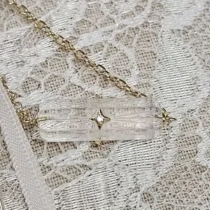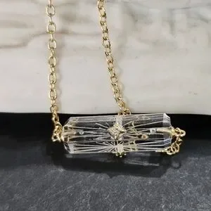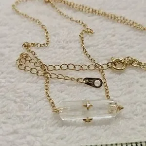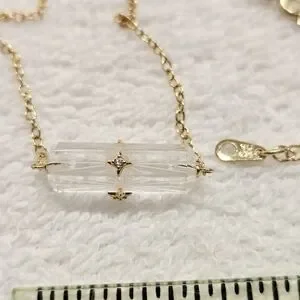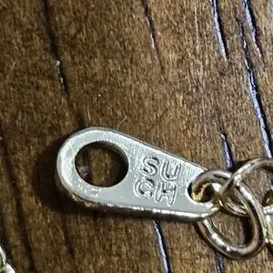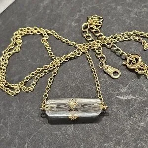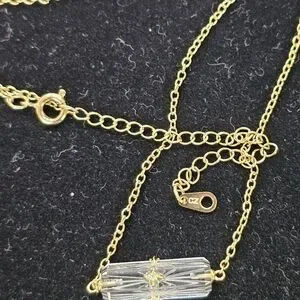 This beautiful 925 silver gold vermeil and crystal necklace features a faceted, etched lozenge-shaped crystal with CZs on each face of the crystal . The chain of this necklace appears to be 925 golden vermeil, and it is not attracted to a magnet except for the clasp. The necklace is marked on its hangtag with SU CH on one side and CZ on the other. It measures approximately 18" when open & laid flat with its extender in full-length use . This pretty piece us condidered to be in Very Good Used Condition. Please see all pictures for details, condition, and size comps.