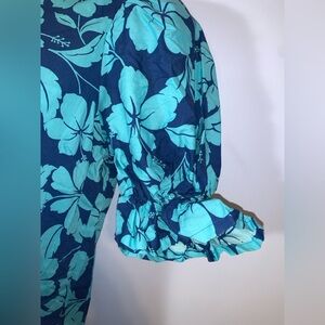 Handmade hibiscus Floral Blue Dress short puff sleeve mermaid square neckline S