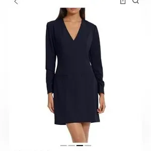 Sophisticated black mini dress with V-neck. Long sleeves and sleek design. Ideal for elegant occasions. Approximately 34 inches long. Never worn. Perfect condition.
