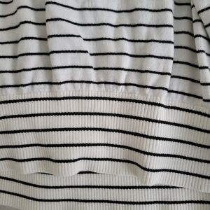 Blavk and white short sleeve sweater with wide arm openings, tapered ribbed hem