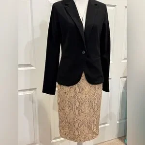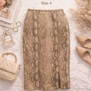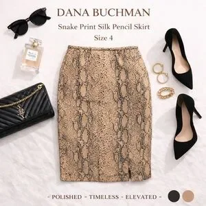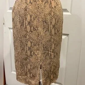 This Dana Buchman pencil skirt features a sophisticated neutral snake print in warm beige and black tones. The classic pencil silhouette and subtle back slit make it a perfect power-piece for office, dinner, or elevated everyday styling.