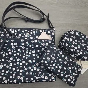 Stylish Kate Spade crossbody handbag set with a floral pattern in navy blue. Includes a matching wallet and pouch. Easy to clean material. Perfect for everyday use.