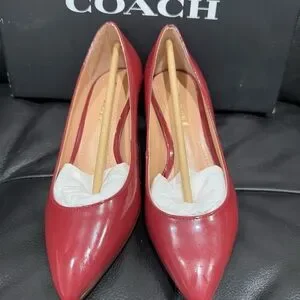 Chic red patent leather heels by Coach. Sleek design for versatile wear. Kitten heels and perky points update your entire wardrobe in COACH's pretty Sloane pumps.