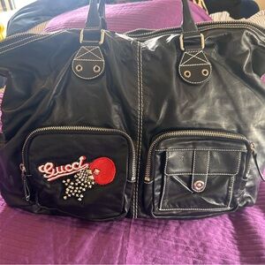 Elegant Gucci duffel bag in black leather. Features bold red accents and stylish front pockets. Silver studs in the pocket.
