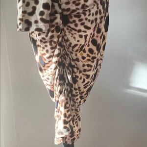 Size Medium animal print Runched fit flattering Jennifer Lopez slight off shoulder dress. 3/4 inch long sleeve stretchy material. 37 inches long and 17.5 inches pit to pit lying flat.