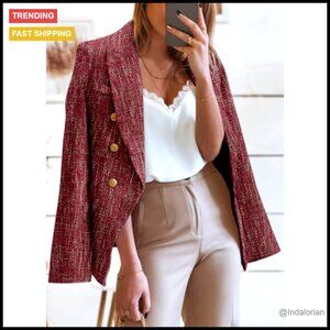 Tweed Blazer Double Breasted Open Front Slim Fit Work Office Casual Chic