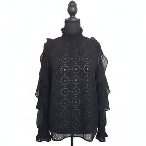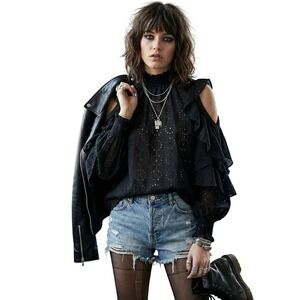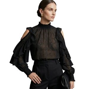MAJE Paris Metallic Eyelet Ruffle Cold-Shoulder Blouse Sheer Size 1/S NWOT $325