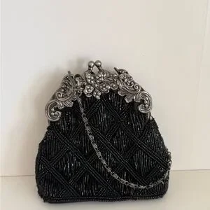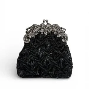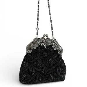 Vintage Black Beaded Evening Bag Ornate Silver Tone Frame Kiss Lock Clutch