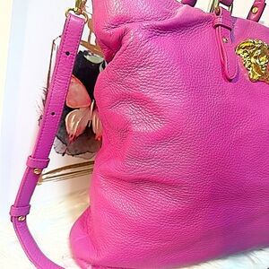 a Versace Pink Leather Palazzo Medusa Tote Bag, featuring a signature gold-toned Medusa head plaque and a detachable shoulder strap.