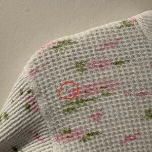 See last two photos for flaws. Tiny hole on upper left front, light blue stain lower back left (extremely faint - I never noticed it until inspecting to list - I have not attempted removal). Price is firm.