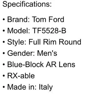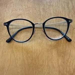 Pre-Owned in Excellent condition. Elegant dark eyeglasses by Tom Ford. Comes with a brown case. They do have prescription lenses, but these could be taken out. I have 20/20 vision (I am farsighted), and use glasses for reading, computer work, TV. They have blue light lenses, as well. Please see model number information in last picture. Comes with the case and cleaning cloth.