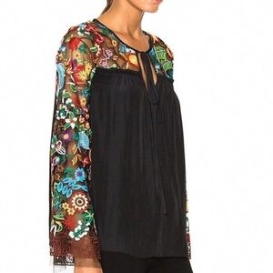 Elegant black top with vibrant floral embroidery. Perfect for adding a pop of color to your wardrobe.