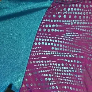 This stylish kids' gymnastics leotard features a vibrant purple and blue design. Size CL - child large