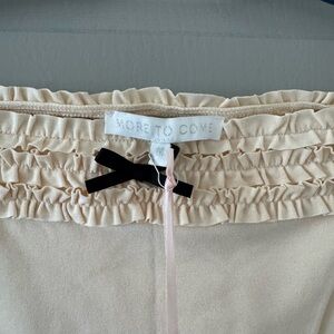 Chic off-shoulder design with ruffle trim. Features a cute bow accent. Ideal for casual or dressy occasions.
