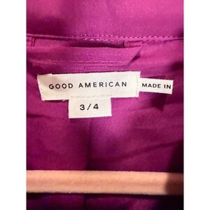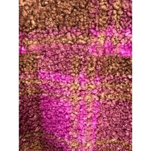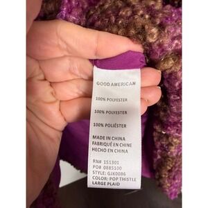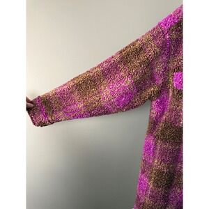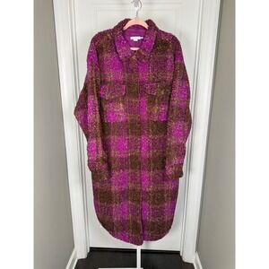 Stunning Good American oversized sherpa plaid shacket/coat in bold magenta and brown tones. Ultra-soft textured boucle-style fabric with a relaxed, cozy silhouette. Perfect for layering over sweaters, dresses, or athleisure.
