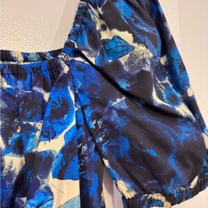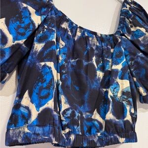 Embrace a chic look with this stylish blue floral off-shoulder blouse. Perfect for adding a touch of elegance to your wardrobe.
