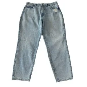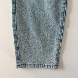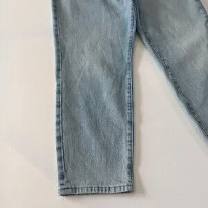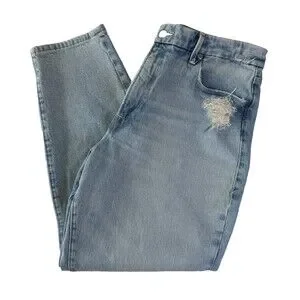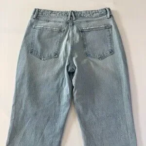 The product is a pair of women's high waist Mom jeans in a distressed light wash blue. They feature a zip and button closure, a classic fit, and a 5-pocket design. The jeans are made from a cotton blend denim fabric with a light wash, making them versatile for all seasons. With a size 10 waist and a 30-inch inseam, these jeans by Good American offer a trendy and comfortable style for everyday wear.